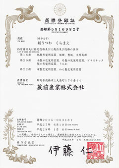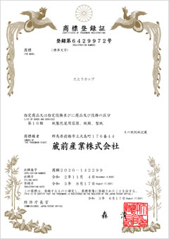 ↑ 特許・認定・受賞トップへ戻る登録商標 紙うつわ くらまえ(標準文字) 登録番号 登録第5816982号 登録日 平成29年6月19日 登録内容 紙容器事業並びに新パッケージ事業の屋号として"紙うつわ くらまえ"の標準文字が商標登録されました。ブランド力を生かした「1ランク上のおもてなし容器」を展開してまいります。 -