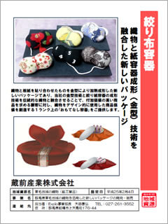 ↑ 特許・認定・受賞トップへ戻るプラン名 群馬県東毛地域の織物を活用した新しいパッケージの開発・販売 認定日 平成25年2月4日 主催 関東経済産業局 プラン内容 地域資源である群馬県東毛地域の伝統商品の織物を生かし、かつ金型技術と絞り紙容器の成形技術を活用し、従来にない新しいパッケージを開発します。 商品としては、①織物と板紙を貼り合わせたものと②織物だけのものをプレス金型により加熱成形したパッケージです。 -